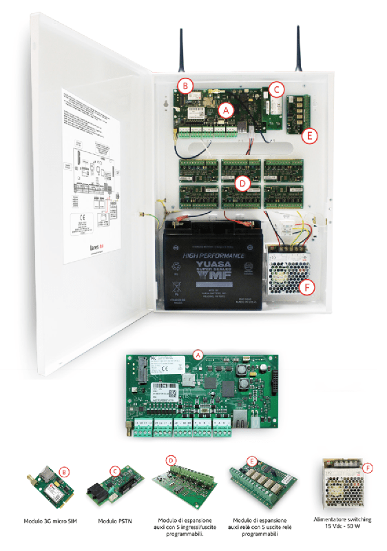 Contenitore metallico 325×435×90 mm, verniciato bianco, dispositivi anti-strappo e anti-apertura, base rimovibile, spazio per 7 moduli di espansione e una batteria di back up da 18 Ah. Di serie il contenitore viene fornito con alimentatore Switching da 50W